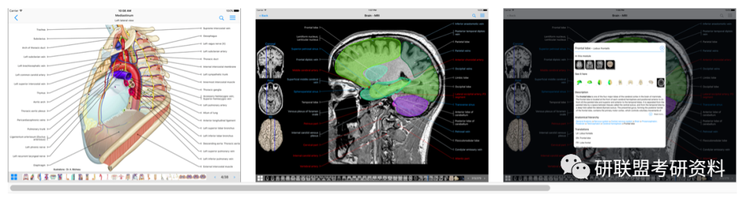 IMAIOS e-Anatomy是针对医生、放射科医生、医学系学生及放射师而设的人体解剖图集。e-Anatomy来自于获奖的线上解剖图集e-Anatomy,可以在手机或平板上浏览最详尽的人体解剖参考 。e-Anatomy收藏了超过37万5千个解剖结构,以及超过5千4百个已翻译的医学标签。里面有一共5个图片单元:CT、MRI、放射影像、解剖图示及核子影像。单元主题包括颞骨岩部CT、脸部CT、脊髓图示、淋巴结CT、动脉CT和图示、骨盆MRI等。